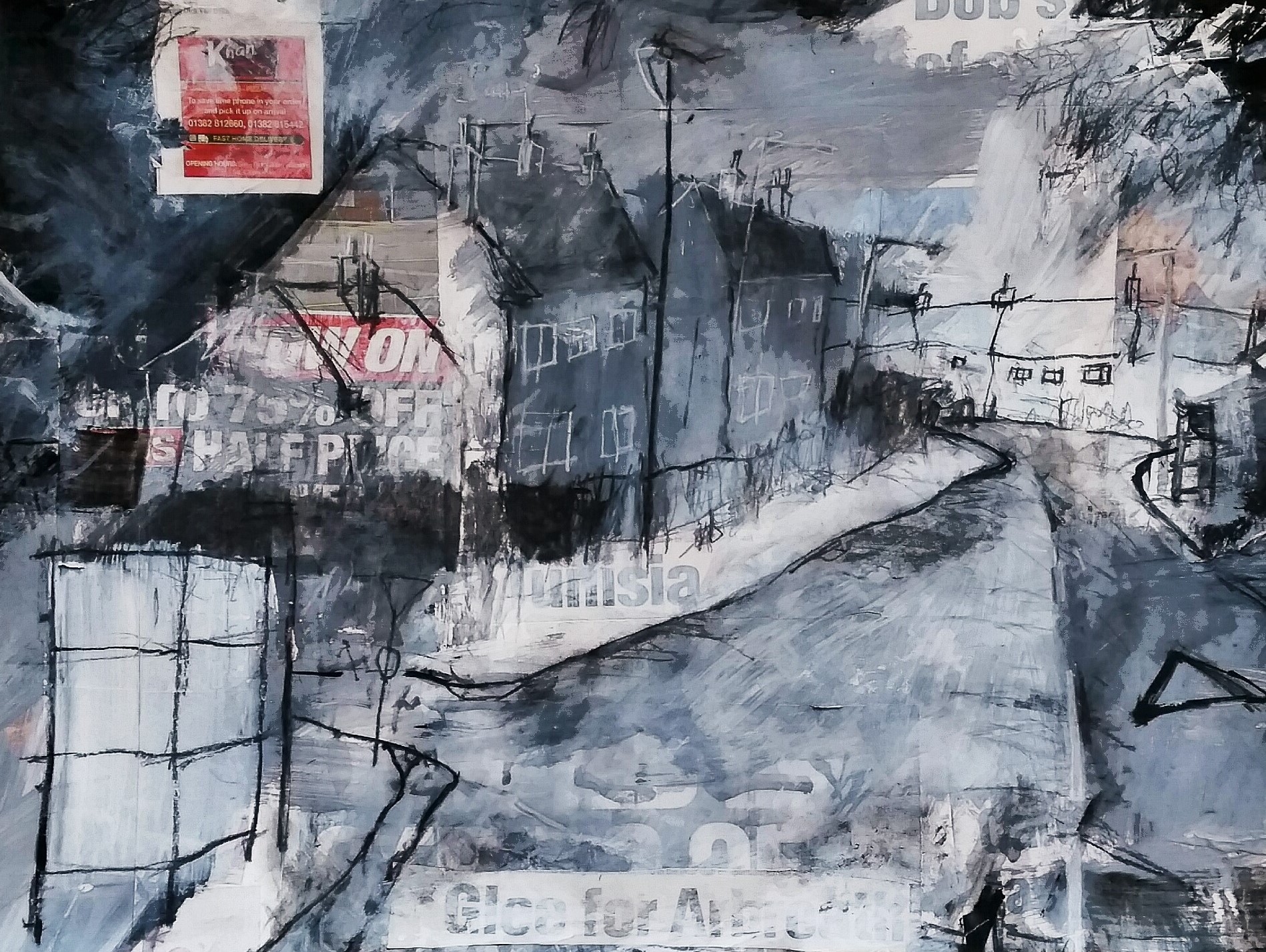 Acrylic, gesso, conte pastel and charcoal on Evening Telegraph July 3rd 2015. Title- ‘Bobs half price sale’ from the newsprint in painting.