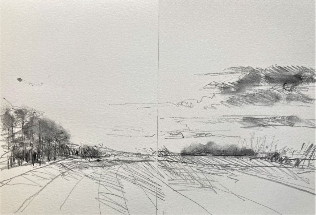Where the sun has not yet reached, frost glitters on fallen leaves. Startled deer crash through the undergrowth where newly truffled earth says badger. Sticky buds of the sycamore house a flock of long tailed tits singing their winter songs. Beyond the wood the hedgerow casts long shadows acrosss the field from a pale winter sun.