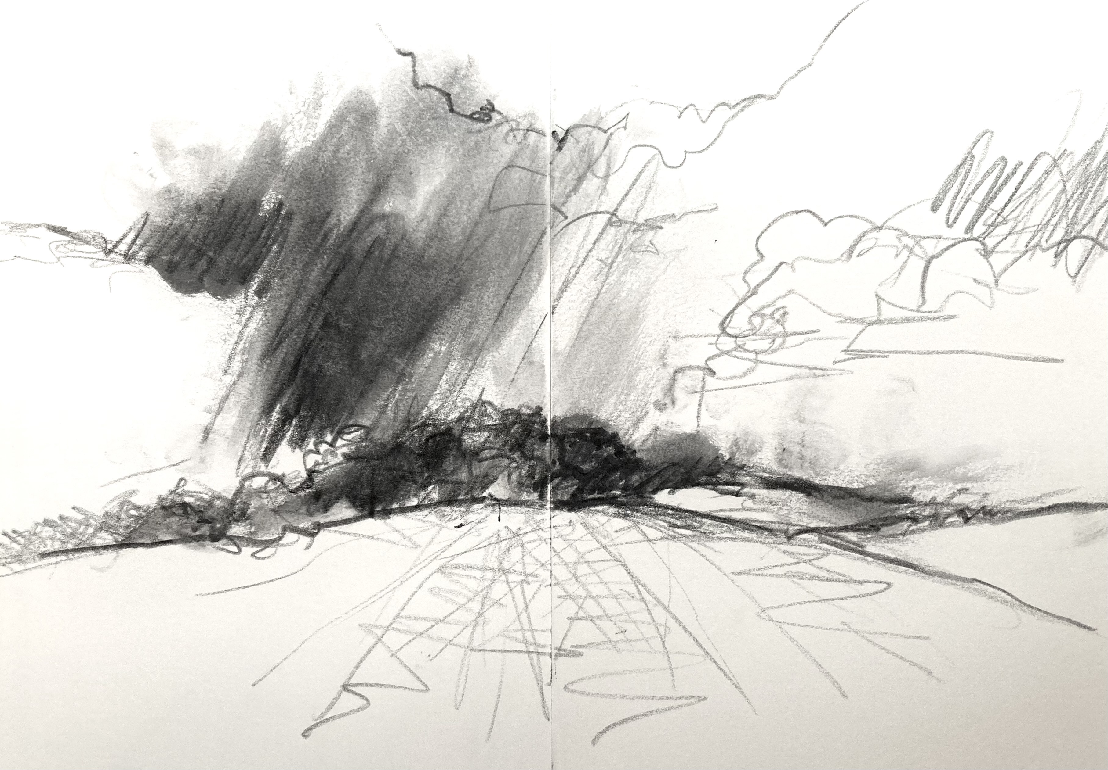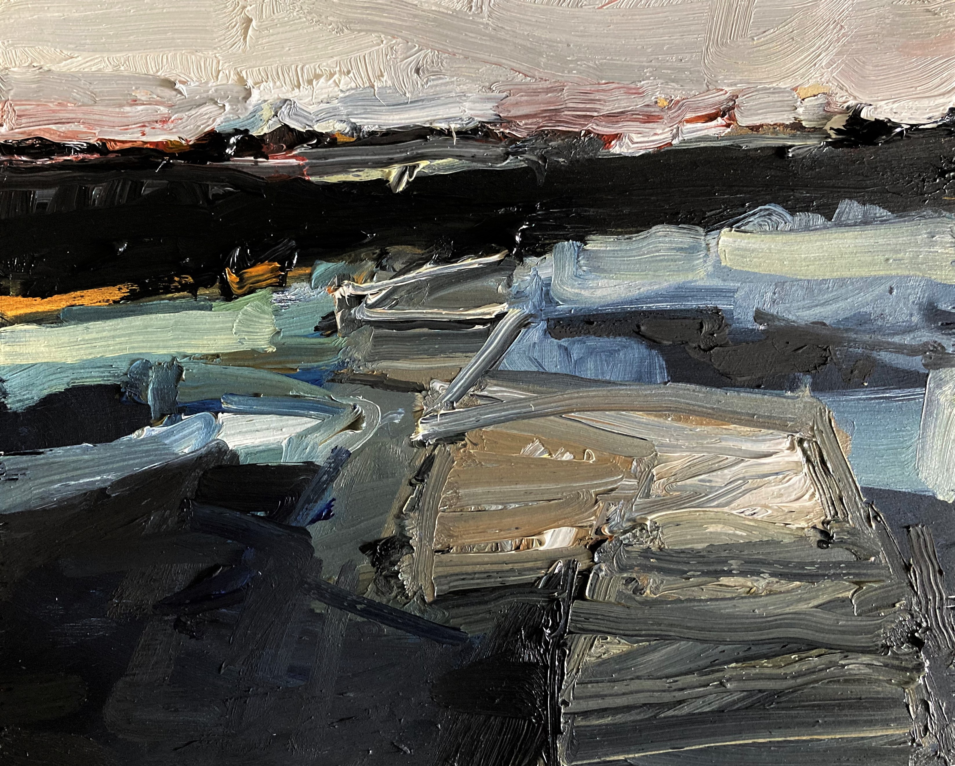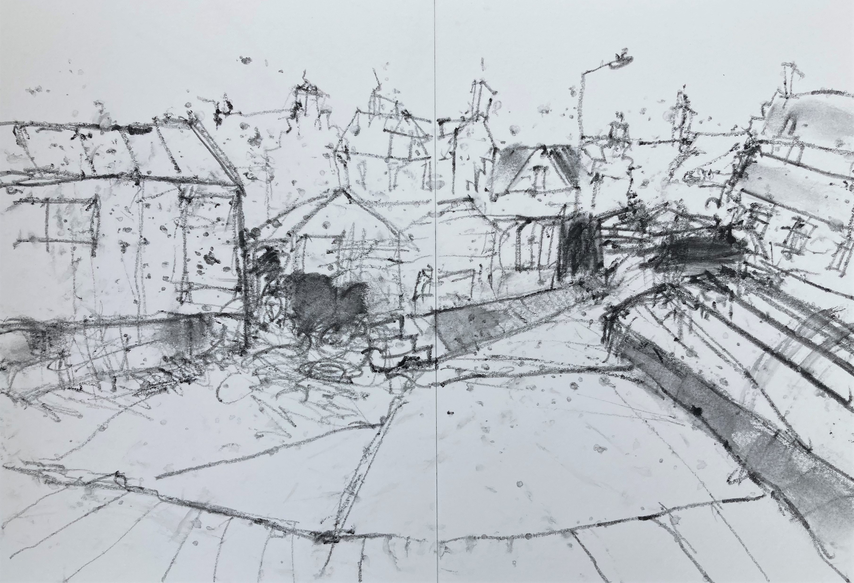 Soft, wet blanket of rain pins down the landscape. A man in green wellies schluffs along the road with a bottle of milk, a woman hurries on with a daily paper under her arm. The coverlet starts to lift in the southwest corner, toes of cloud poke out from under, wiggling the rest of the warm dry sky to rise. Drawing the sheds at the far end of the harbour. Iron rails descend the slope to the waters edge, where once boats were built and launched. At the top of the slipway a rowing boat planted with scarlet tulips named ‘Dignity’. A shower of rain returns spotting the paper .