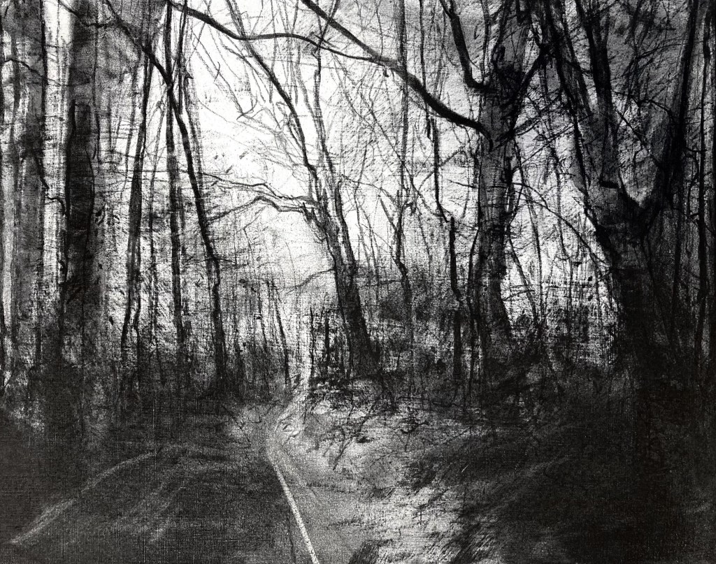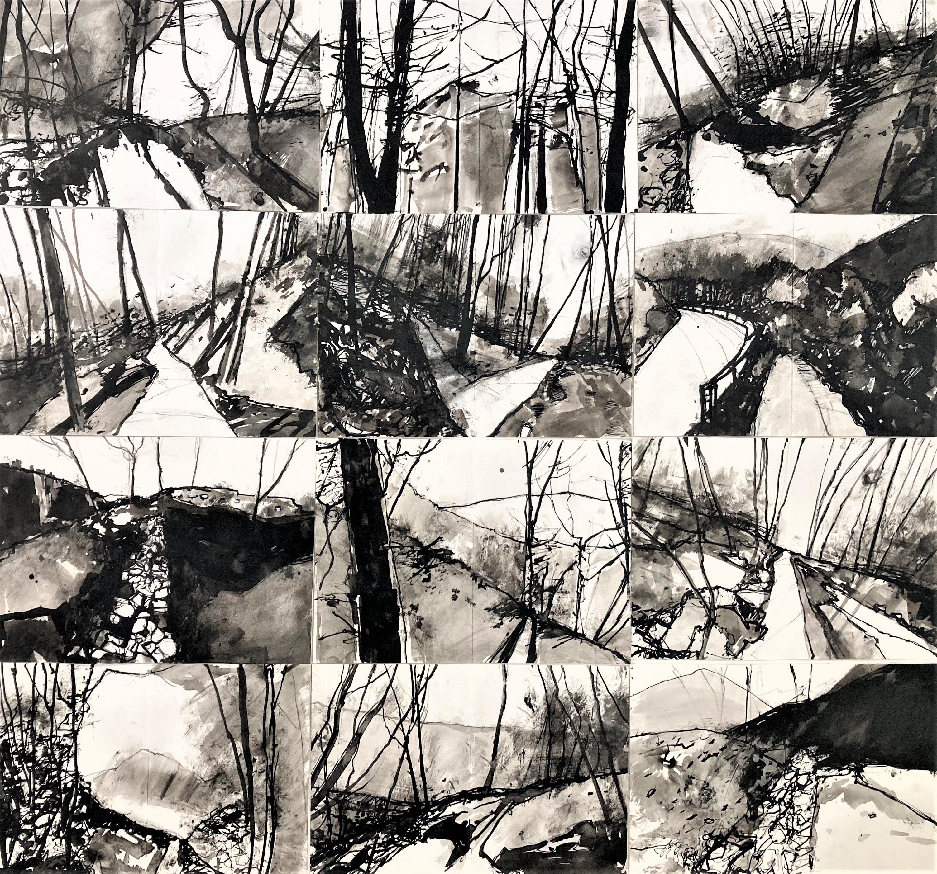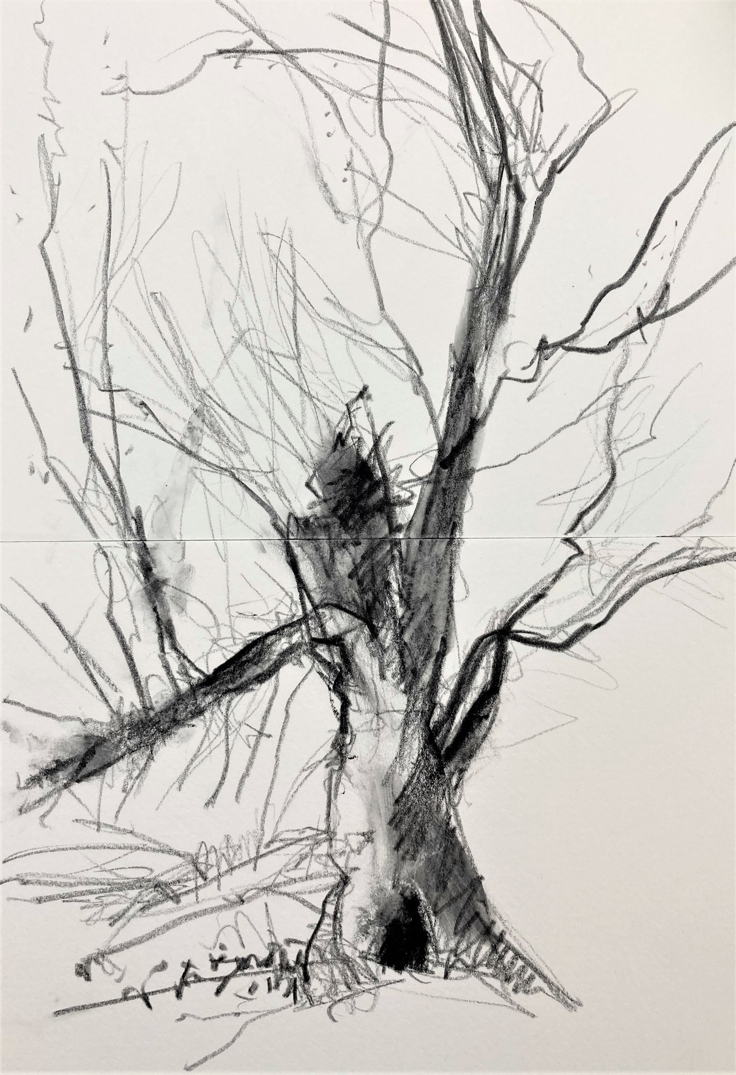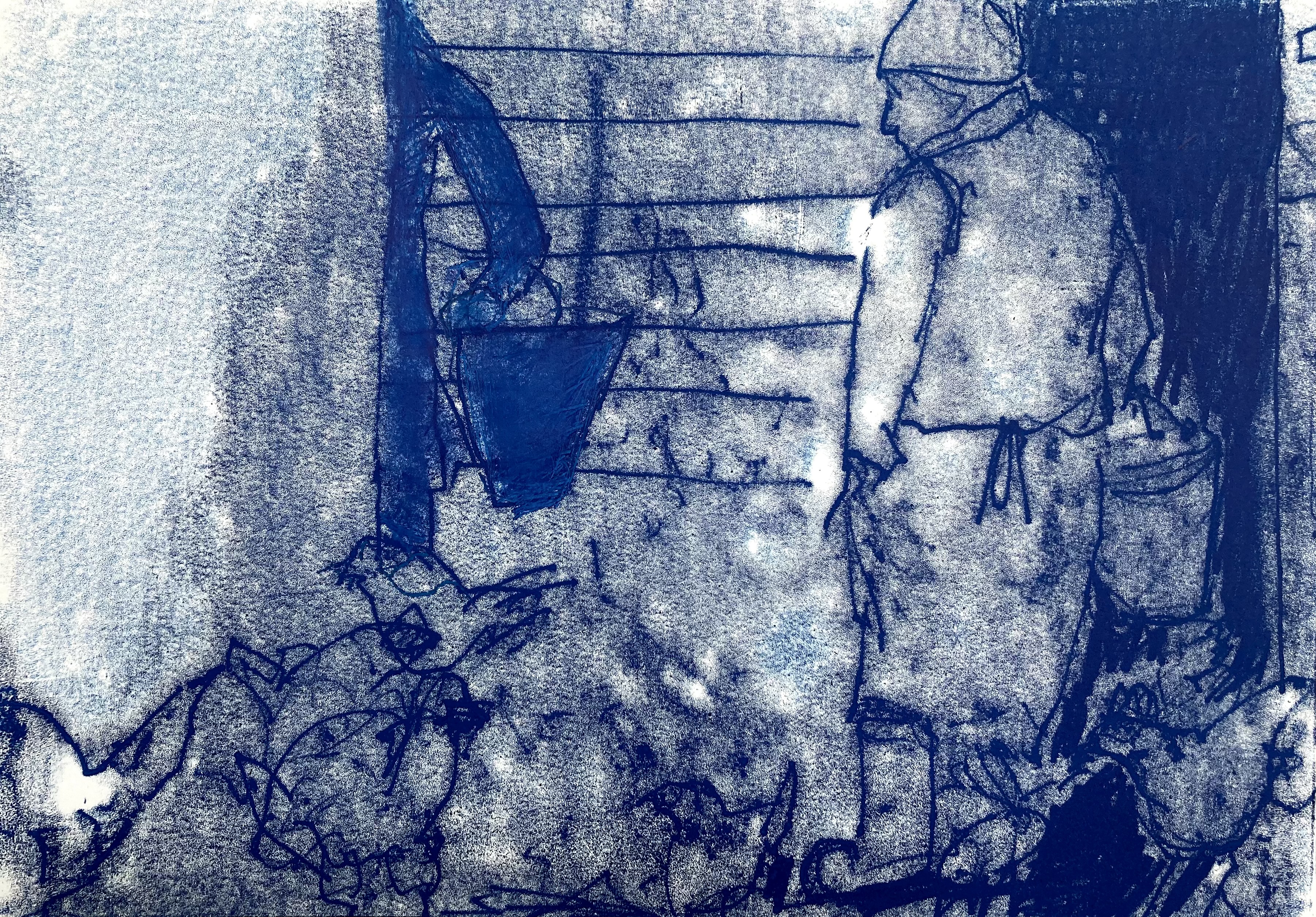Soft, wet blanket of rain pins down the landscape. A man in green wellies schluffs along the road with a bottle of milk, a woman hurries on with a daily paper under her arm. The coverlet starts to lift in the southwest corner, toes of cloud poke out from under, wiggling the rest of the warm dry sky to rise. Drawing the sheds at the far end of the harbour. Iron rails descend the slope to the waters edge, where once boats were built and launched. At the top of the slipway a rowing boat planted with scarlet tulips named ‘Dignity’. A shower of rain returns spotting the paper .