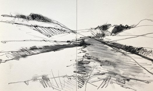 The river turns estuarine here. It runs slow and brown. Mudflats pewter sheen in the low sun. Bony reeds crackle. Oystercatchers, redshank, curlew, their songs echo across the hills. The tide is turning out there.