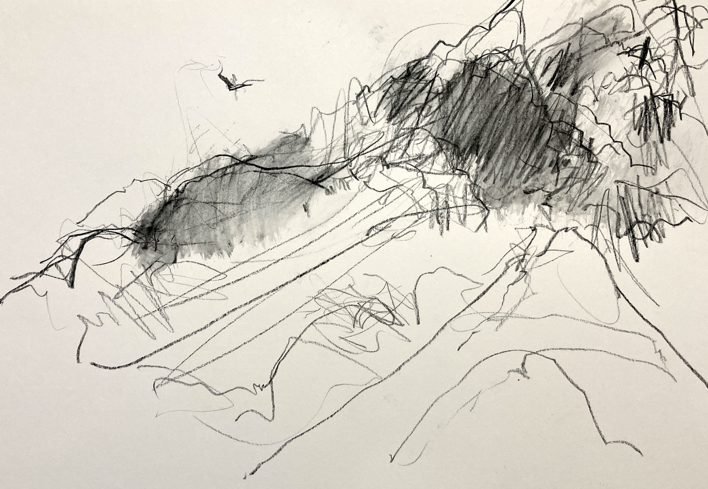 The Buachaille Etive Mor, Stob Dearg. Pools of blue ice refelecting the sky, everything steeped and sunken against this east wind. Serpentine roots of heather curl round smoothed boulders of granite, skelped lichen crusting. Sun shadows as the sky quickly darkens, rain clouds gather. Drawing lines and shapes of moor and rock. Downhill I follow a burn, only a hands width as it travels, carving small canyons in the peat. Here the water falters, slows then drops, cascades, ox bow bends, divides and splits again, smaller and narrower bronchioles over the moss sponge lungs of the mountain. Looking back, snow catches on high ledges, drifts in gullies, zig-zagging. A golden eagle swoons the southern flank, a herd of red deer watch as I scratch a likeness of sorts.