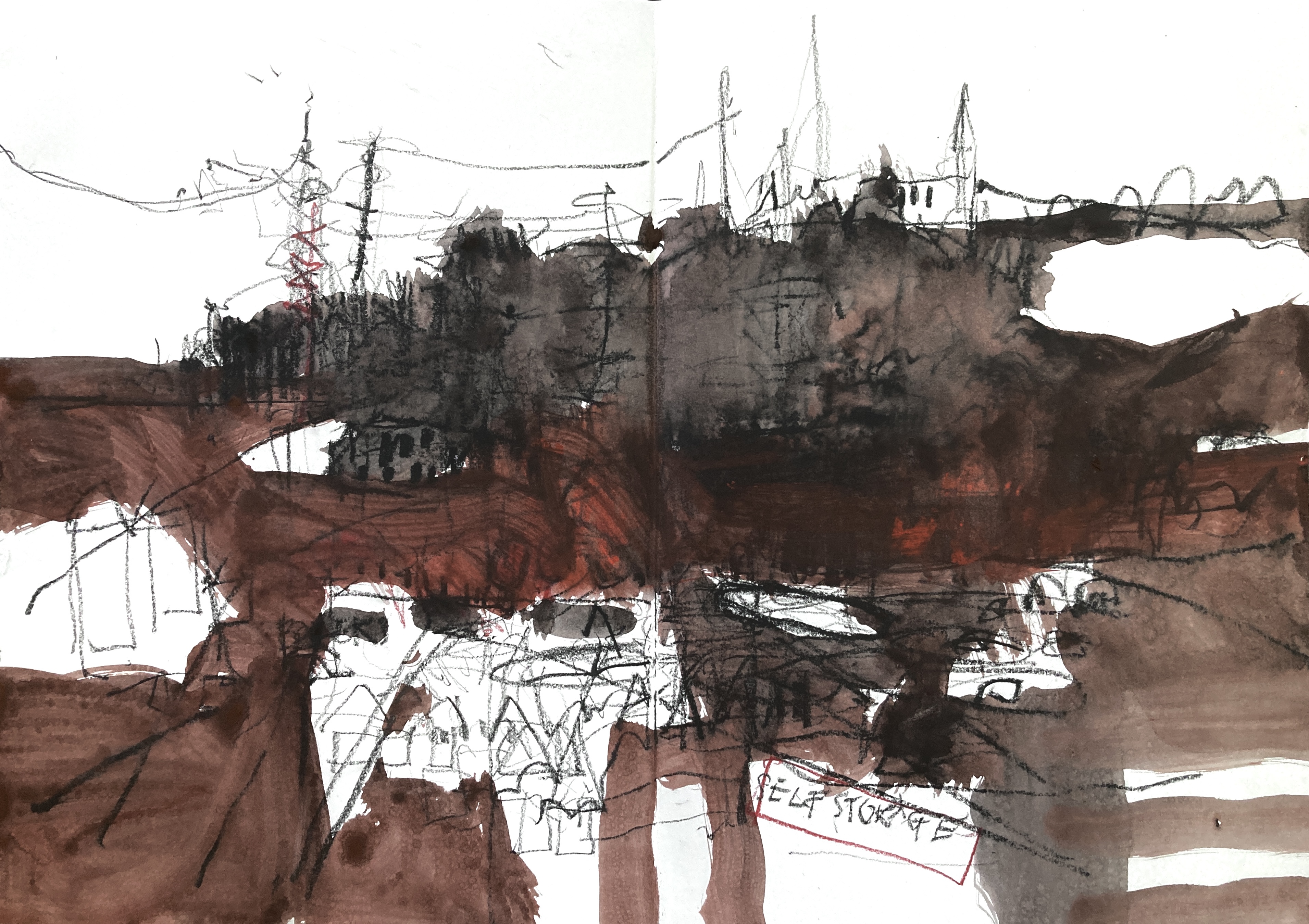 Hot sun on the saltmarsh. Crusted, cracked, peeling cakes of mud. Scurvy grass and sea thrift. Gun metal grey clay smears the runnels and funnels and channels making islands and lagoons. Birdsfoot imprints skitter this shore line, darting dragonflies. Lines of wooden stumps fetch out into the belly of the river, cockling and netting. A breach in the sea wall, the incoming sea seeps like spilt tea across a kitchen floor. A thrum of insects, the hum of traffic, mega pylons, the oil refinery’s intestinal tracts edge the land, wild, dystopic, a marginal co-existence. The tide is rising.