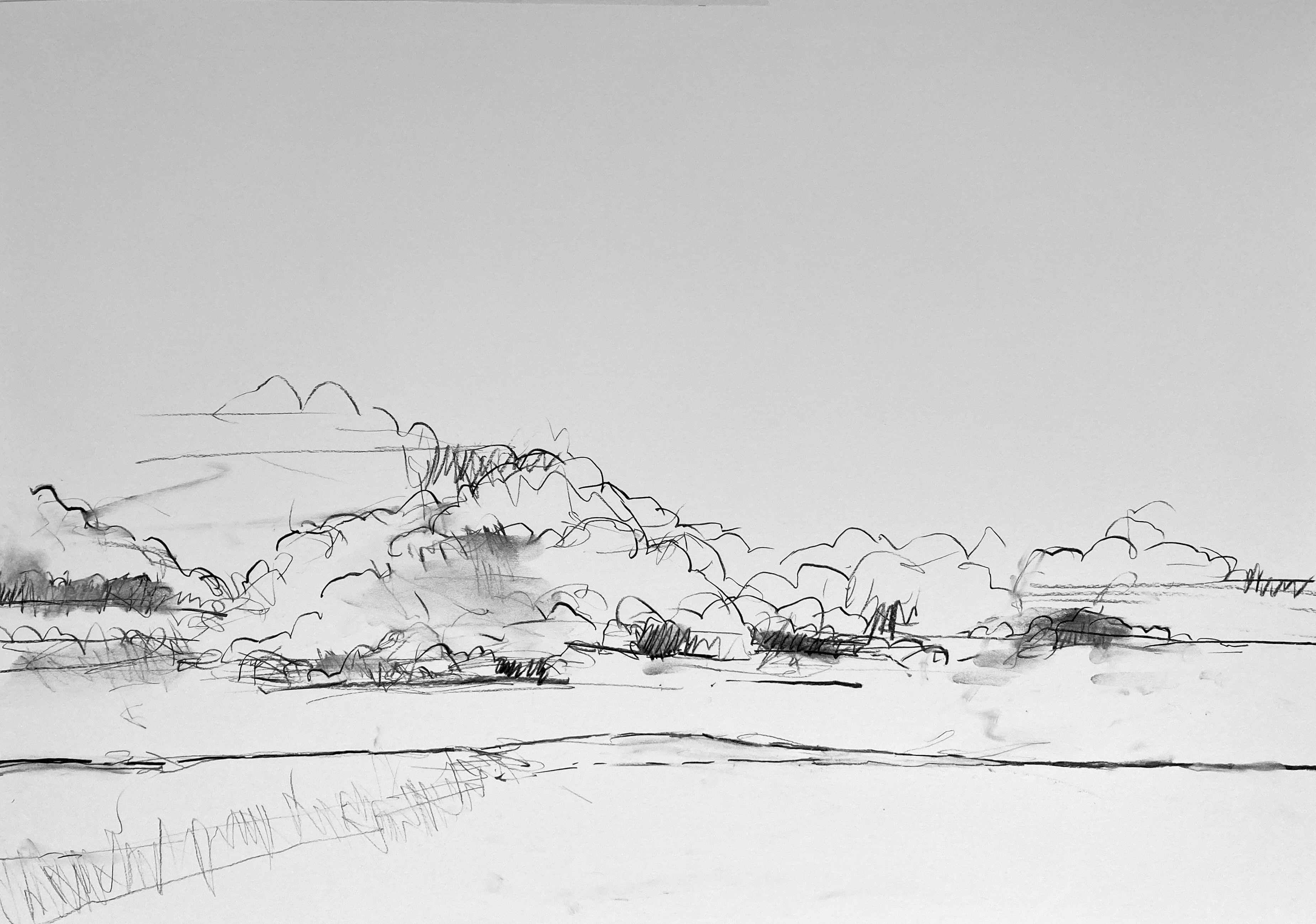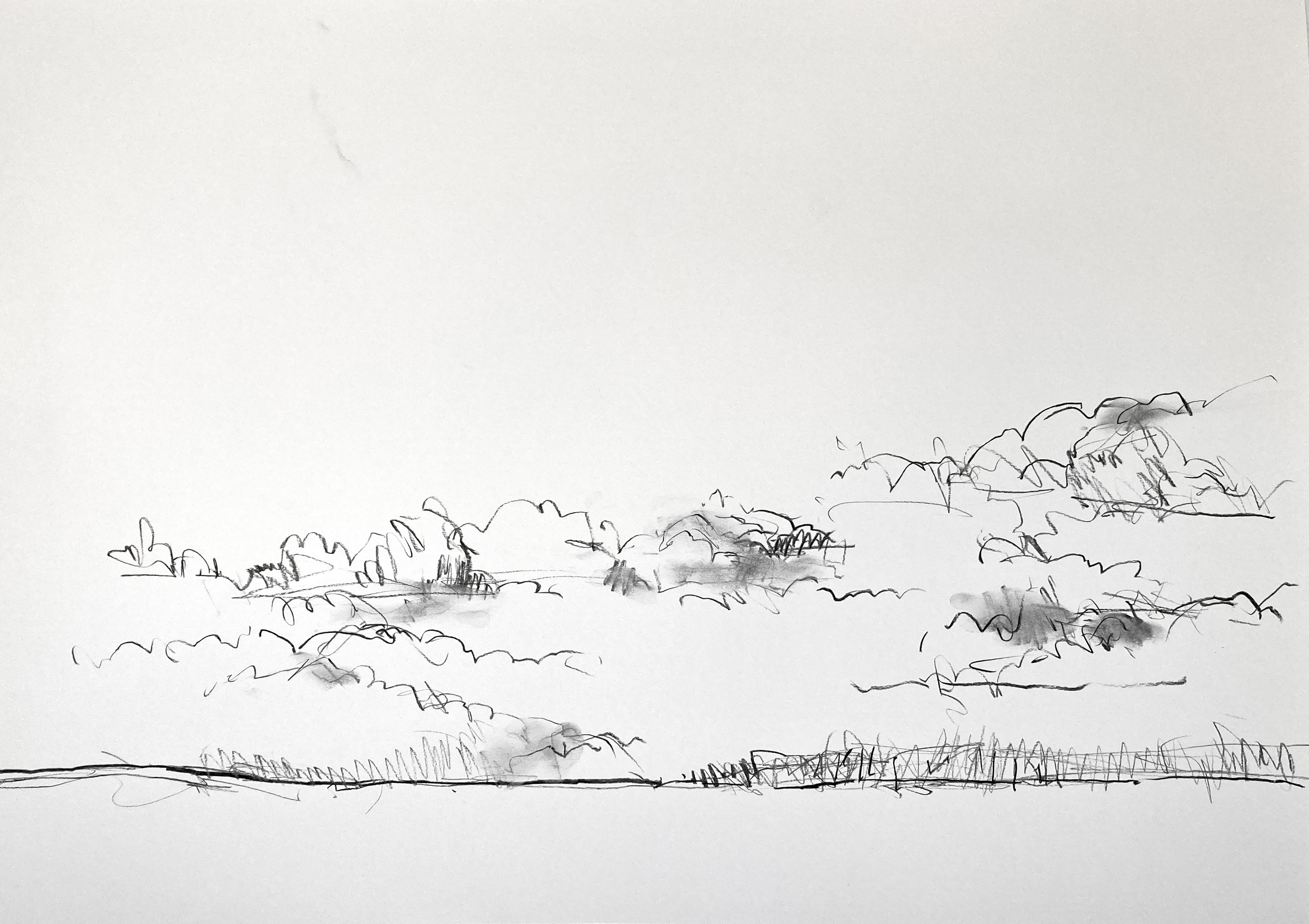 Outside a flock of curlews in the field to the west of the studio. I look up what a flock of curlews is – a curfew, a salon or a skein. I like the idea of a salon, seems fitting from the studio doorway. Clouds building in the west, a bitter north wind. A buddleia and a foxglove have seeded under the threshold of the door. Drawing where I am, what I see today.