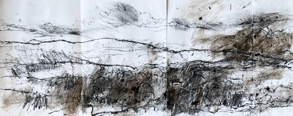 Water juggles over rock, through trees, emptying into the moor to join the pooling, trickling, lapping, bubbling bog. My trainers are sucked from my feet, already sodden, shrivelled. The train pulls into the station, a leap across the burn, pink pebbles, embroidered silver lichen. Black velvet pools of peat smell of time, its scent drifts across this impossible place. Flinty, sharpening winds usher clouds, sift icing rain. The mountains disappear. All that remains is the moss beneath my feet, sinking slowly. Above, the sky considers its options, decides to lay low for now at least. Small birds sing their song across the moor. I am gone.