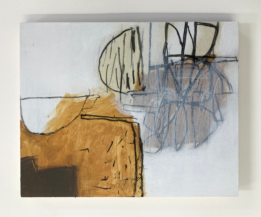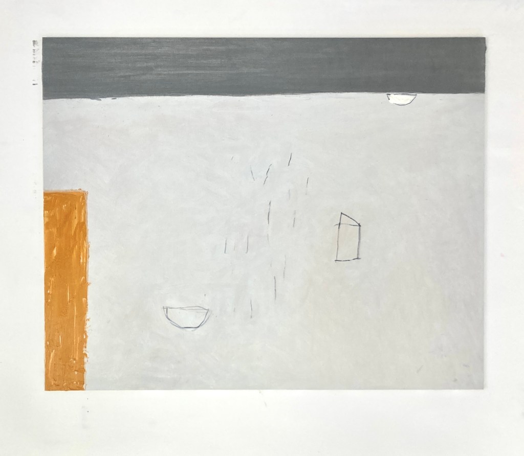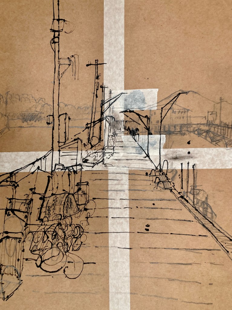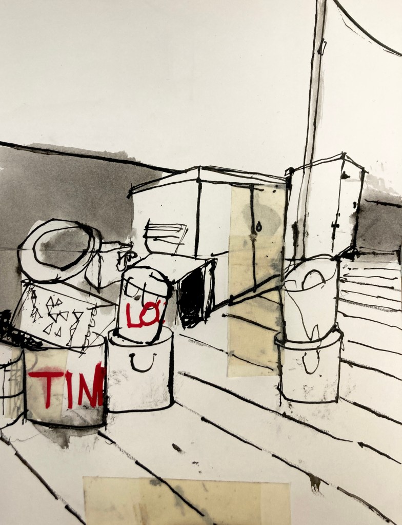 East coast grey, some might call it silver, depends on how full your glass. Today there is a slight sparkle on the water as the small boats make their way back to their moorings. Swallows skim low over the sea, rising sharply before the seawall and back around to dock number two. I am drawing the stuff of fishing – creels and buckets, flags, poles and other useful things, spilling out, a guddle, fankle of ropes. I look out beyond the walls of the harbour to the island in the Forth and beyond, the Pentland Hills, their edges rubbed graphite on paper. The only cololur here is that of tackle, buoys and boats of course – neons of orange and yellow and saltire blue. Everything crossed for the football tonight.
