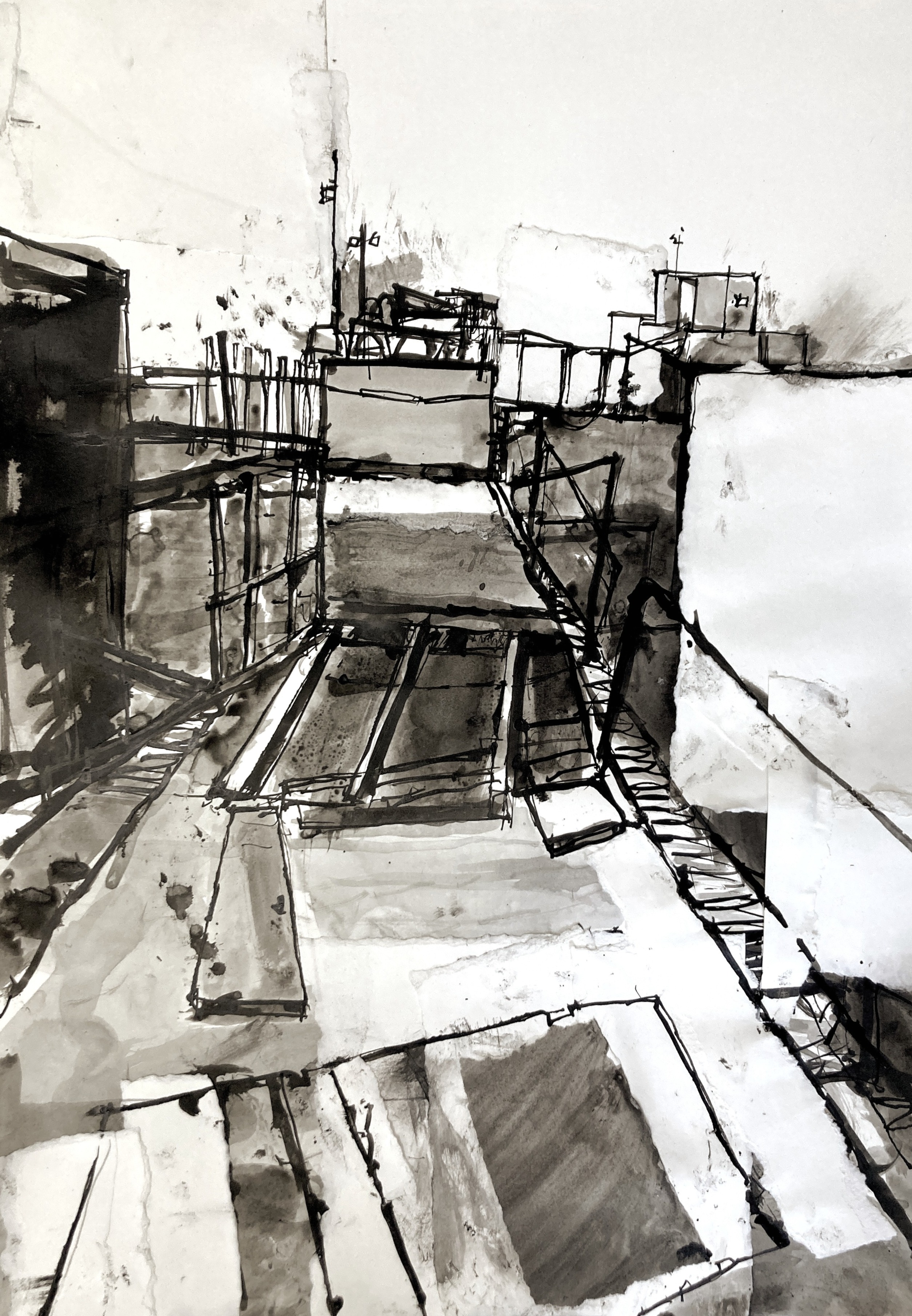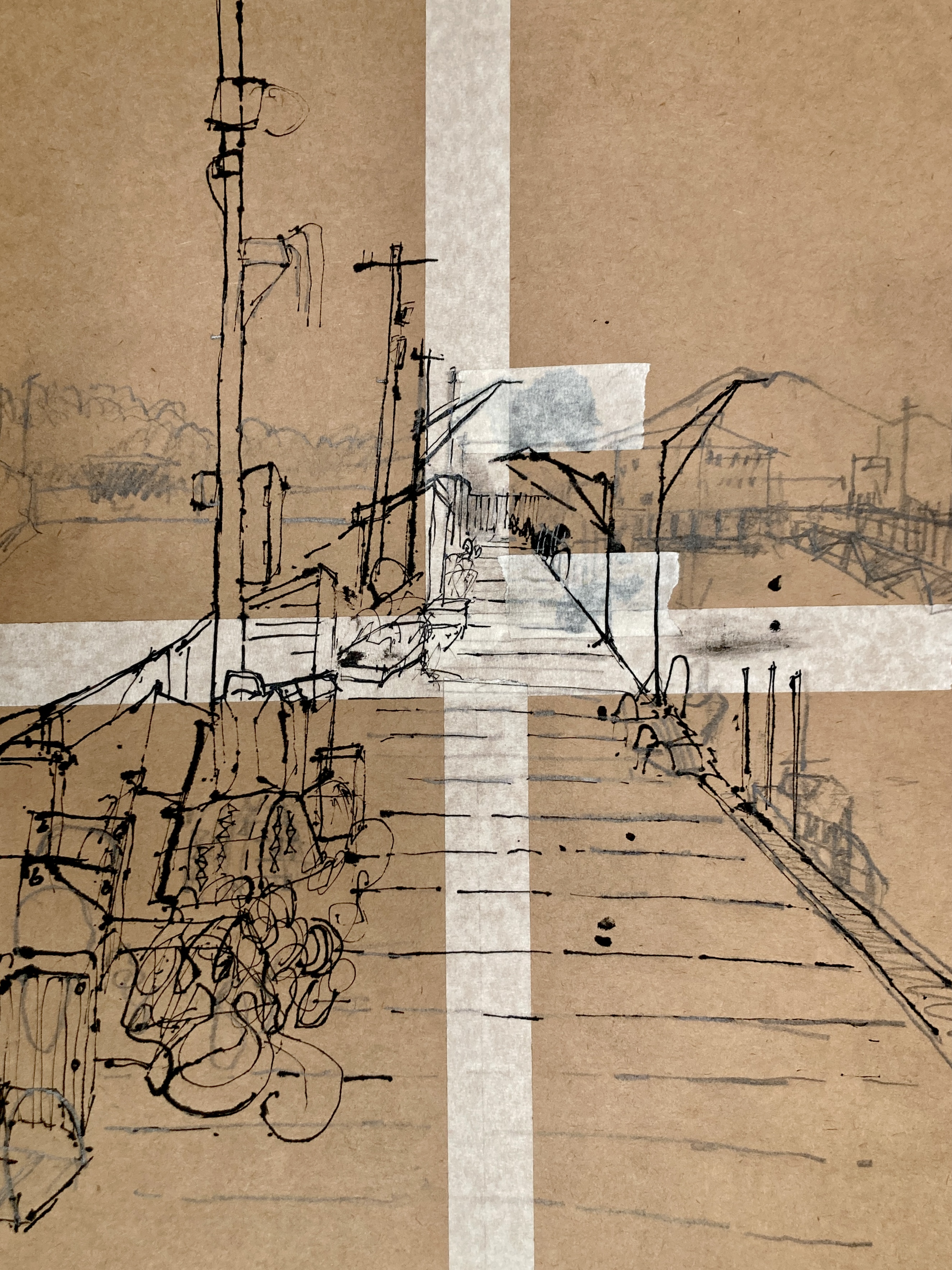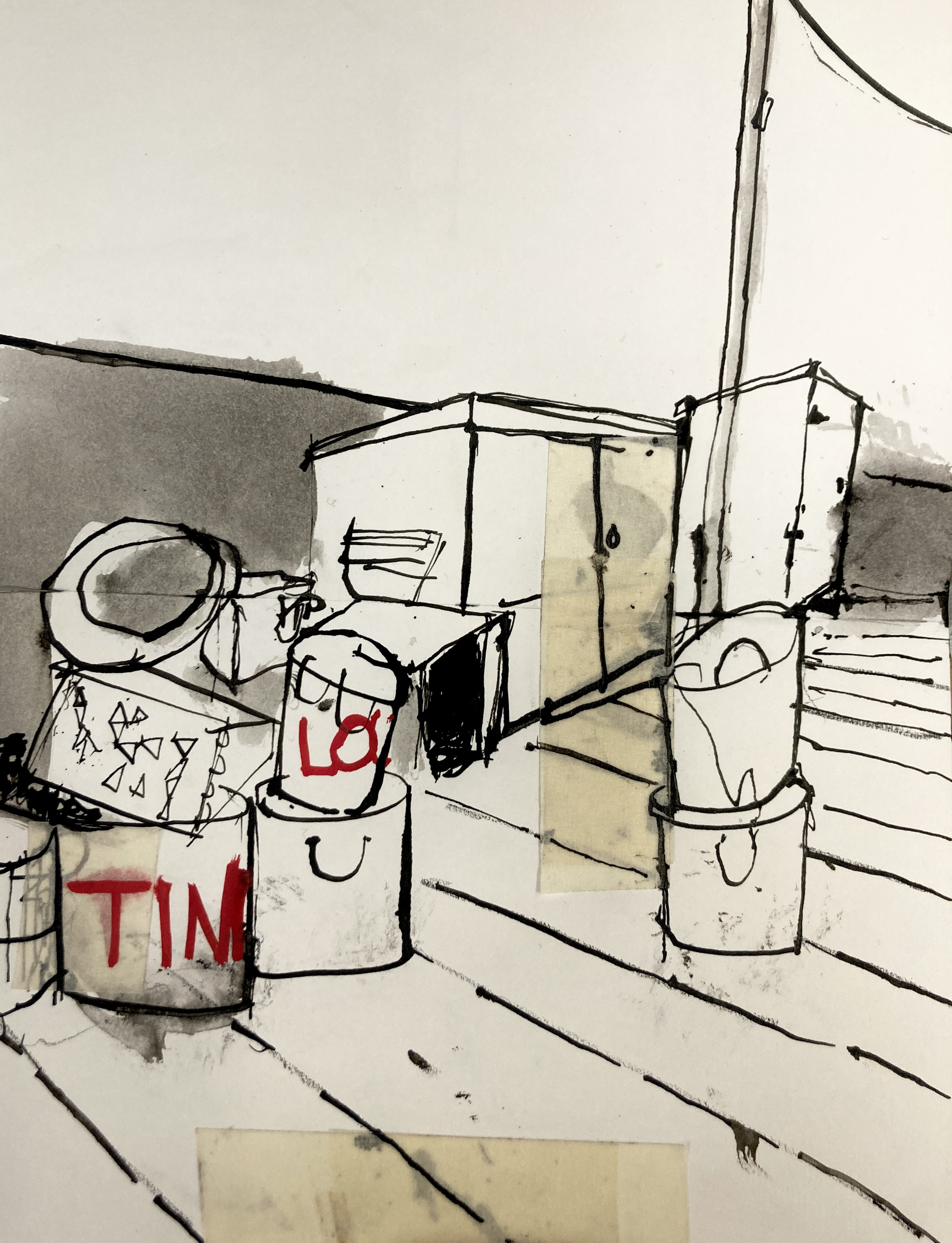 The wind flaps shed doors on too small hinges, ripples a delaminating plywood roof. A constant state of nearly undone. Slatted sun under the pier, rain on its way.
