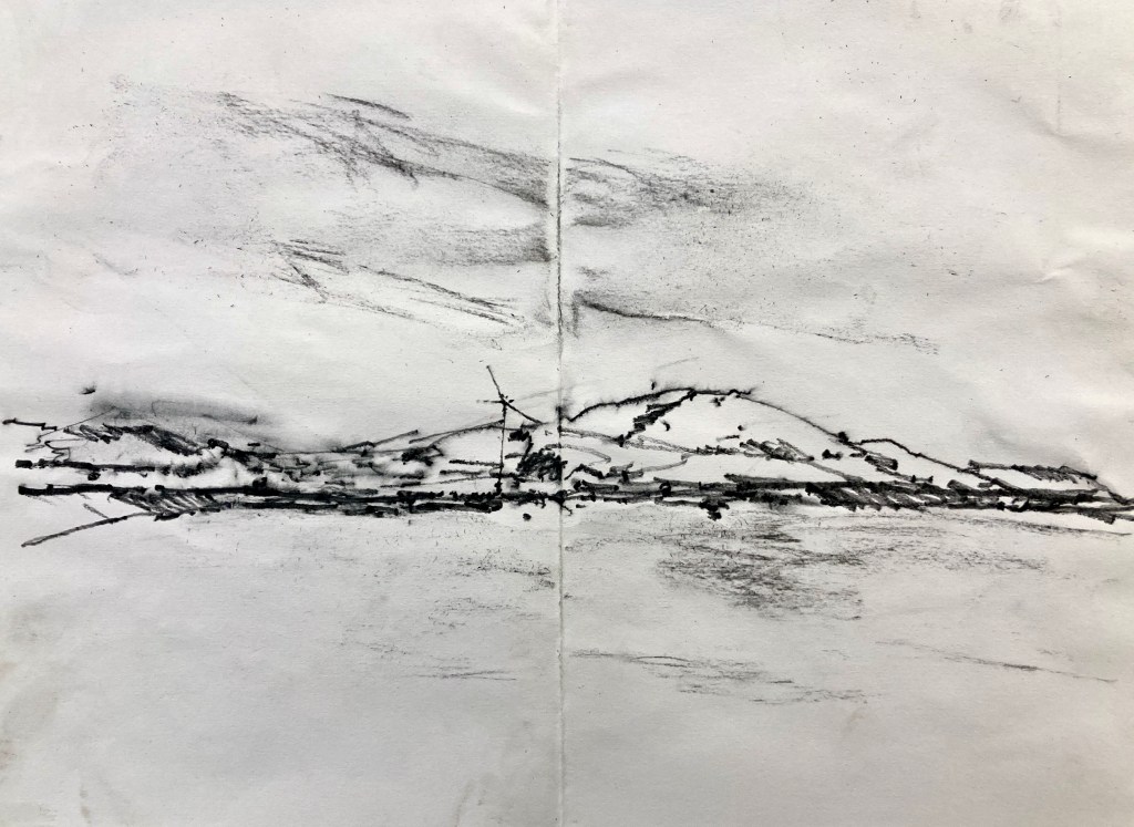 Leaving the harbour with the smell of diesel under a grey duvet sky, past the Harland and Wolff yard and the sleeping seals on the rocks below the giant turbine. A shag flies over the stern and eider ducks bob. Trying to draw the land from the sea as the boat shuggles this way and that . A slag heap from the old mines, an oil rig out in the Firth. A landscape of energy – coal, wind and oil all within sight. A breif cast for mackerel. Not biting, we head back.